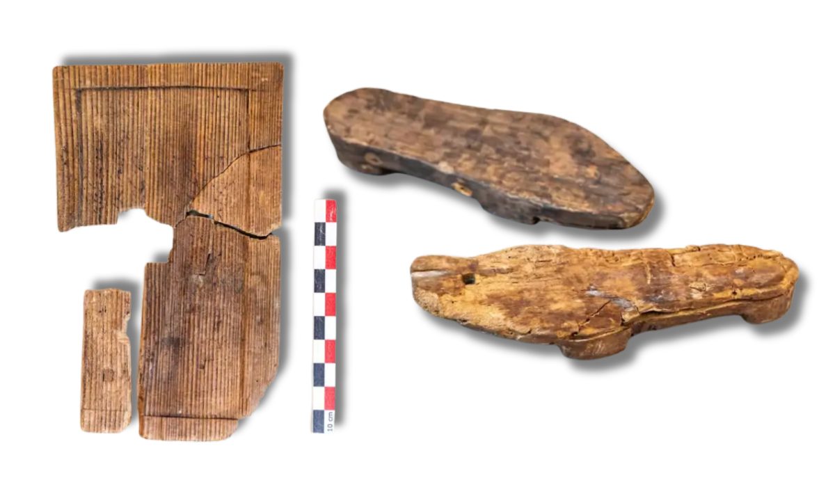 Además de las tablillas romanas, los arqueólogos hallaron dos suelas de madera de arce pertenecientes a un calzado romano conocido como sculponae, una especie de sandalia de madera sujeta con correas de cuero.