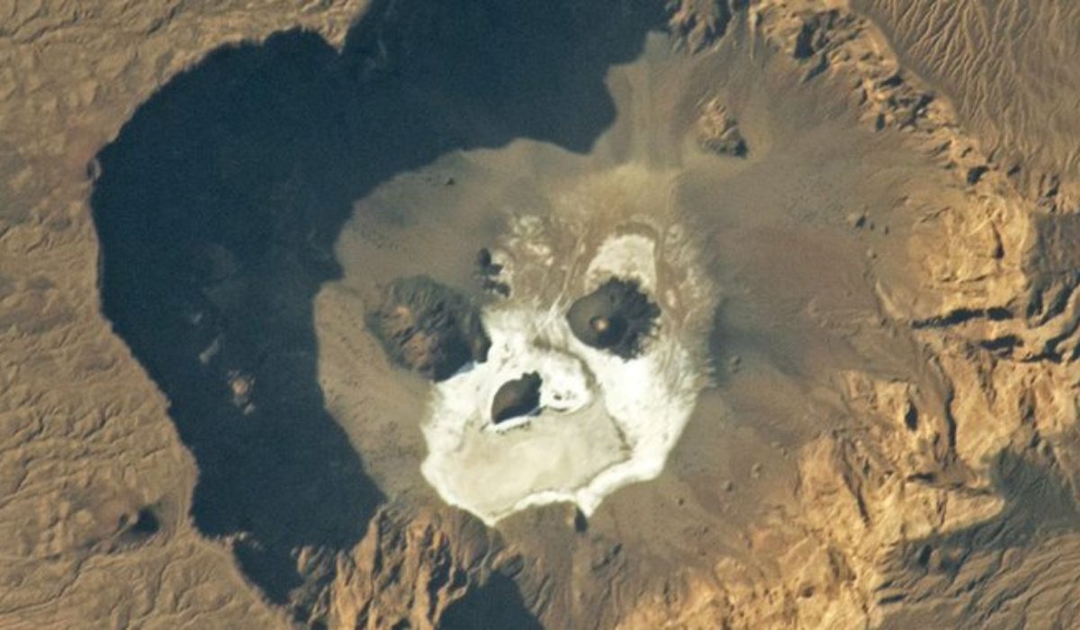 Caldera que vista desde el espacio, parece el rostro de una calavera tallada sobre la arena.