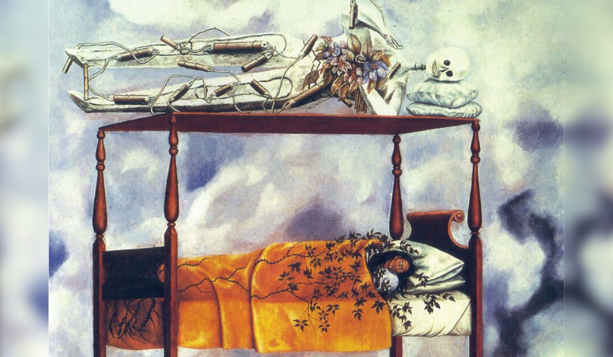 La pintura muestra a Kahlo recostada en una cama flotante entre nubes, cubierta por ramas de árbol.