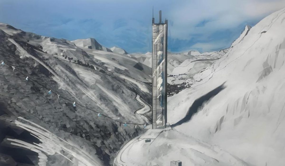 El proyecto contempla una torre de 260 metros de altura, ubicada en una de las estaciones de esquí más exclusivas de Europa, en un entorno dominado por la nieve y las montañas.